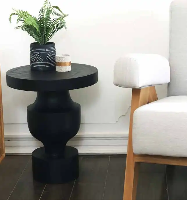 Приставной стол от Don Maison изготовлен из массива дуба. Его необычная ножка и насыщенный черный цвет придают особый стиль. Высота стола — 50 см, диаметр столешницы — 45 см.
